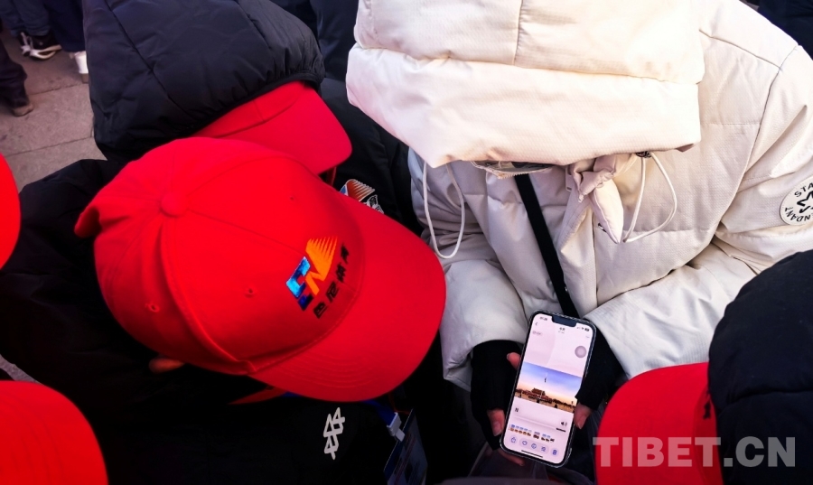 圖為熱心遊客為西藏自治區那曲市色尼區青少年足球隊的少年們一行播放用手機拍攝的升旗儀式視頻 攝影:劉莉