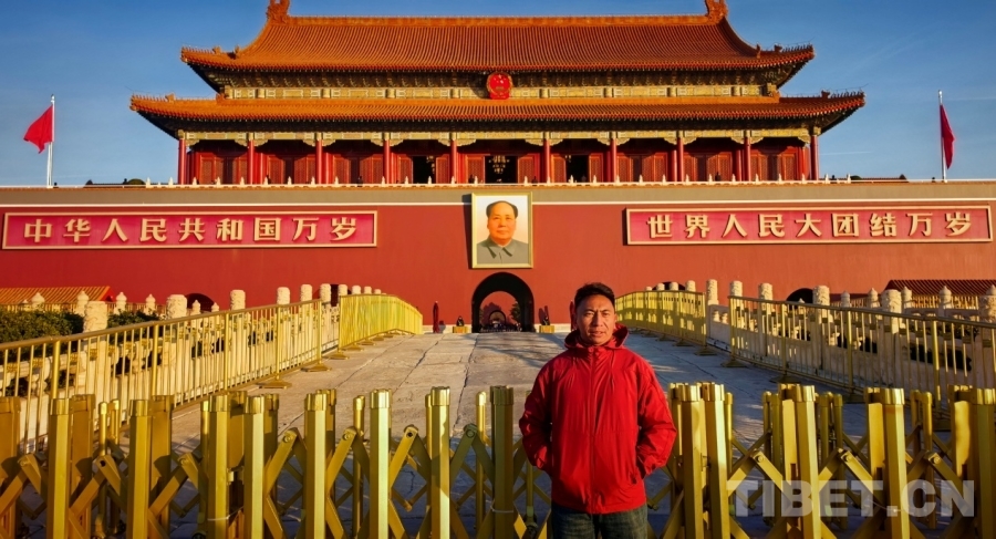 圖為西藏自治區那曲市色尼區青少年足球隊中場球員多傑頓桑在天安門廣場與國旗合影 攝影:劉莉