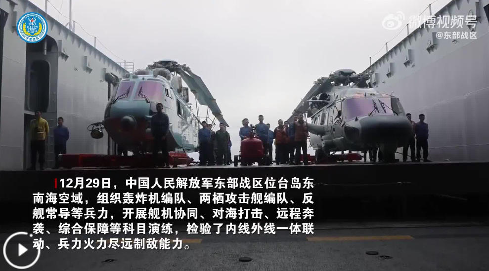 12月29日,中國人民解放軍東部戰區位臺島東南海空域,組織轟炸機編隊、兩棲攻擊艦編隊、反艦常導等兵力,開展艦機協同、對海打擊、遠程奔襲、綜合保障等科目演練,檢驗了內線外線一體聯動、兵力火力盡遠制敵能力。(東部戰區融媒體中心)