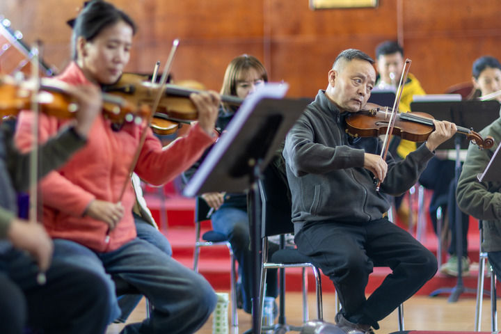 西藏自治區歌舞團小提琴演奏家羅雪萊(右)在進行排練(2025年11月3日攝)。新華社記者 姜帆 攝
