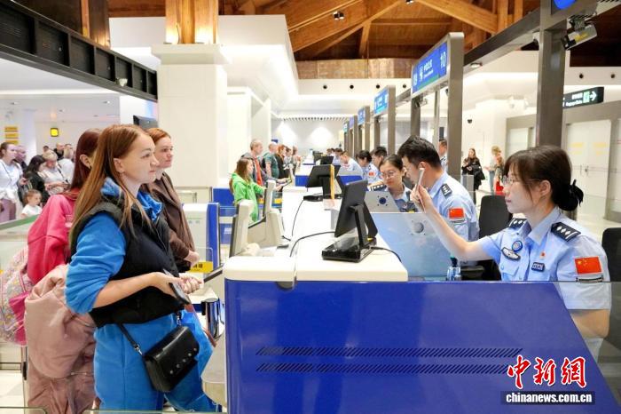 2026年1月1日淩晨,來自俄羅斯符拉迪沃斯托克的SU856次航班搭載155名旅客平穩降落三亞鳳凰國際機場。圖為遊客正在辦理入境手續。 王程龍 攝