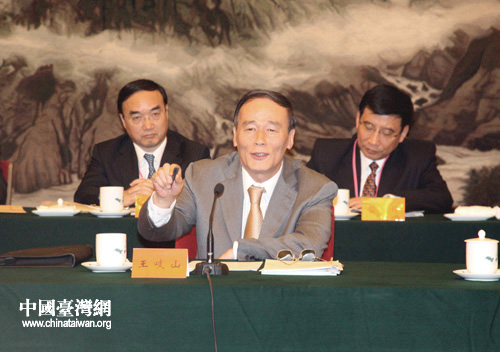 2008年臺商座談會28日上午在北京人民大會堂舉行。國務院副總理王岐山和國務院20多個主要部門負責人及60多位臺灣工商界人士、大陸臺商代表參加座談。圖為王岐山在座談上講話。(中國臺灣網 田雲鵬 攝)