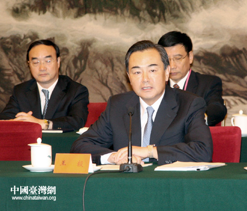 2008年臺商座談會28日上午在北京人民大會堂舉行。國務院副總理王岐山和國務院20多個主要部門負責人及60多位臺灣工商界人士、大陸臺商代表參加座談。圖為中共中央臺辦、國務院臺辦主任王毅在主持座談。(中國臺灣網 田雲鵬 攝)