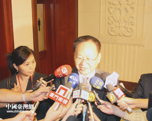 2008年臺商座談會28日上午在北京人民大會堂舉行。國務院副總理王岐山和國務院20多個主要部門負責人及60多位臺灣工商界人士、大陸臺商代表參加座談。圖為全國臺灣同胞投資企業聯誼會會長張漢文在會場外接受媒體採訪。(中國臺灣網 田雲鵬 攝)