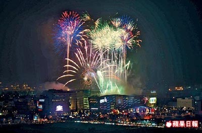 中國臺灣網1月1日消息 據臺灣《蘋果日報》報道,不讓臺北101大樓專美,2010年的第一刻,臺灣中、南部的天空也同步開出燦爛煙花。高雄夢時代廣場長達199秒的跨年煙火秀,1萬8000發萬紫千紅的煙火,與夢時代摩天輪車廂LED燈相互輝映,現場50萬人齊呼:“新年快樂!”雲林劍湖山和高縣義大世界都上演摩天輪煙火秀,劍湖山摩天輪更射出10顆心心和“LOVE 2010”圖樣,現場情侶都忘情用熱吻迎接新的一年。