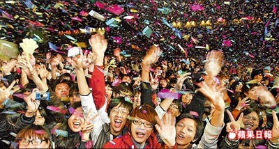 臺中市跨年晚會倒數結束後,撒下慶祝新年的紙花,民眾興奮不已。來源:臺灣《蘋果日報》