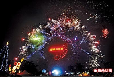 雲林劍湖山的摩天輪煙火秀長達488秒,全臺最久,吸引上萬遊客。煙火變化多達25種,有如絢麗七彩萬花筒,專程由臺北來的阿凱說:“聽說今年劍湖山有許願煙火,請一天假舍棄101跨年,帶女友南下許願。”
