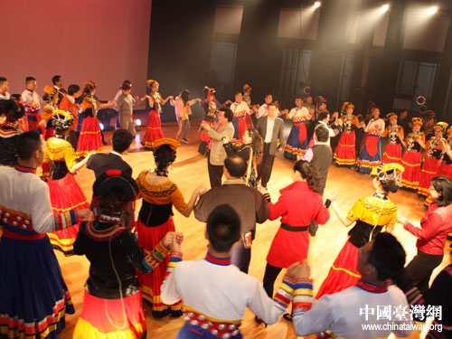 苗栗縣演出結束臺灣民眾與演員們共同跳起歡快的達體舞。圖片來源:四川省臺辦