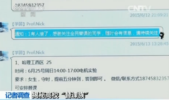 25元一節課 “替課”中介流行網絡替課族們按照課程長短向雇傭他們的大學生們收取費用。那麼,到底是什麼人在為大學生提供替課服務,又是哪些學生有替課的需求呢?他們需要替課的原因又是什麼呢?