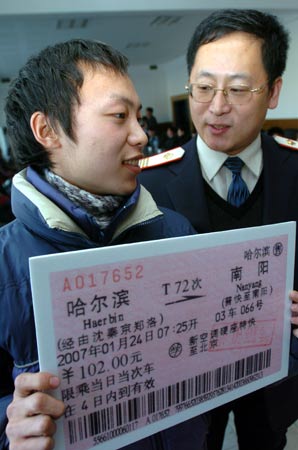 圖片資料:2007年1月19日,哈爾濱火車站副站長武中凱(右)在捐贈儀式上贈給大學生賈紅岩車票。哈爾濱火車站從2006年開始,在全站職工中開展捐贈活動,並用捐贈款購買車票送給那些家庭生活困難的學生在假期返回家中。 (新華社記者崔峰攝)