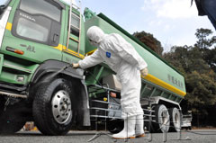 日本宮崎縣內共發生了5例禽流感,與該縣相鄰的大分縣在縣境設立了消毒點,工作人員在對過往車輛進行消毒。29日上午11點攝于大分縣佐伯市。(共同社)