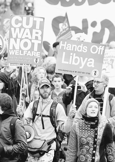 3月26日,在英國首都倫敦爆發大規模遊行示威,抗議政府裁減預算及參與對利比亞的軍事行動等。圖為抗議者打出反對幹涉利比亞的標語。 新華社發