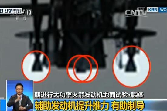 19日,朝鮮中央電視臺以配圖的方式,播送了朝鮮進行新型大功率火箭發動機的地上點火試驗的消息。