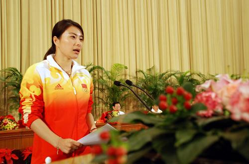 9月11日,第29屆奧運會跳水比賽女子3米跳板、女子雙人3米跳板冠軍郭晶晶在報告會上發言。當日,第29屆奧運會中國體育代表團報告會在北京人民大會堂舉行。新華社發(楊慧峰 攝)