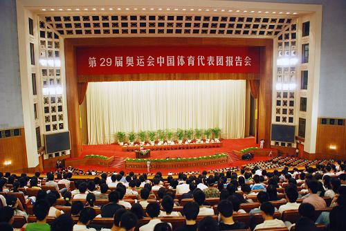 新華社北京9月11日電(記者陳菲)承載著中華民族百年夢想的北京奧運會已經圓滿結束,中國體育代表團肩負著黨和人民的期望和重托,全面參加了各項賽事,以運動成績與精神文明雙豐收的優異成績,向黨和人民交上了一份滿意的答卷。11日,第29屆奧運會中國體育代表團報告會在北京人民大會堂舉行。
