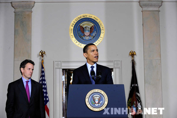 2月4日,美國總統奧巴馬(右)與財政部長蓋特納在白宮就美國公司高管薪酬問題發表講話。奧巴馬當日宣布,接受聯邦政府大筆金融救助款的企業高級管理人員年薪不得超過50萬美元。新華社記者張岩攝