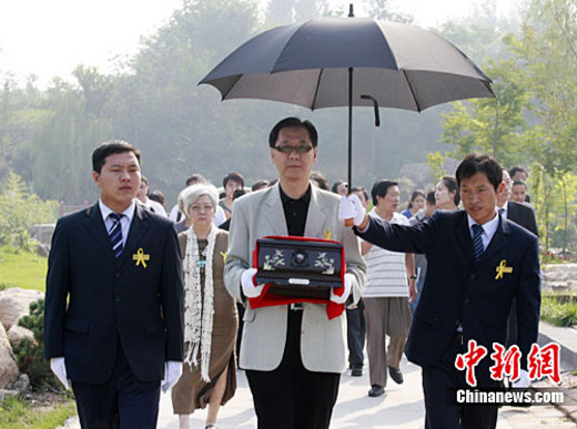 9月12日,臺灣著名作家柏楊骨灰在河南新鄭福壽園陵園下葬,實現了柏楊希望百年之後能夠葉落歸根,安息在中原故土的生前遺願。圖為柏楊兒子郭本城移靈父親骨灰前往墓區。中新社記者 王中舉 攝
