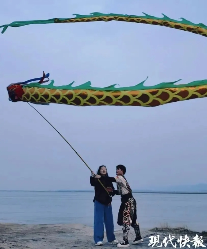 “這‘飛龍’也太帥了吧!”在武陟的黃河岸邊,鄭雅琪瞬間被“飛龍少年”——河南省焦作市武陟縣“黃河飛龍”青年傳承人楊超棟揮動甩桿所“圈粉”,只見9.5米長的“飛龍”在空中盤旋遊走、變幻翻騰,鄭雅琪迫不及待地想親身體驗一番。