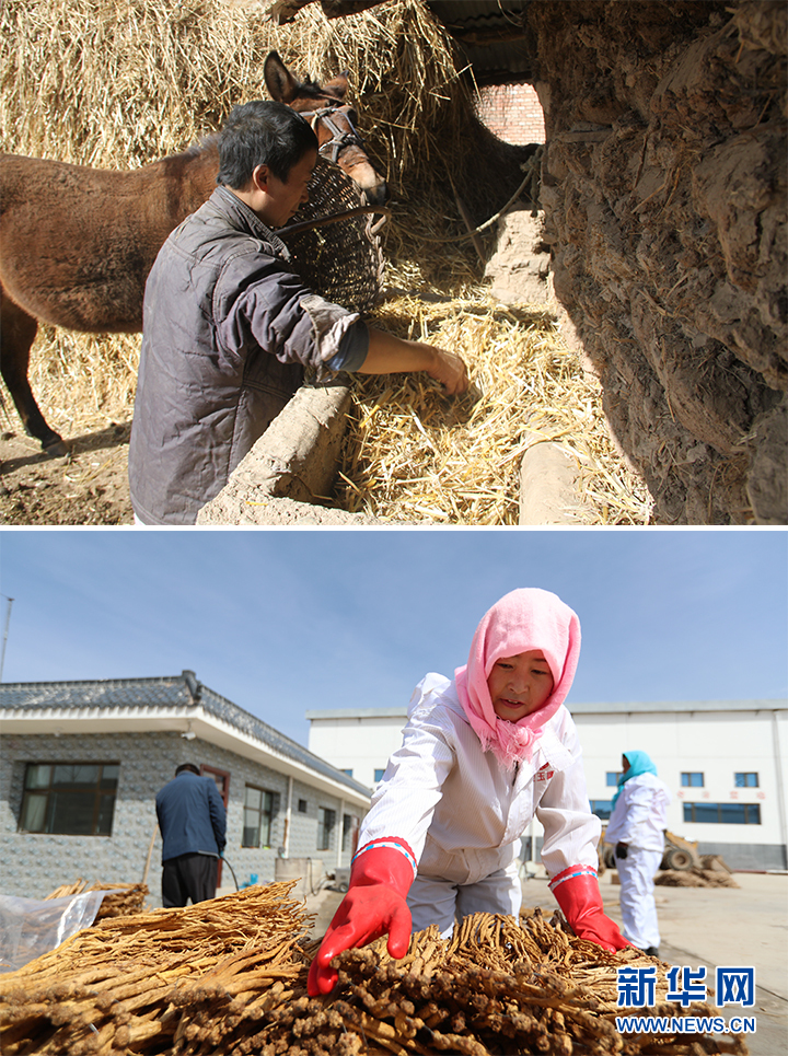 拼版照片:上圖為2013年3月4日拍攝的甘肅省定西市渭源縣元古堆村村民在家養驢的情景。新華社發(吳魯 攝);下圖為2019年3月11日,在渭源縣元古堆村,甘肅聖源中藥材有限公司就業扶貧車間員工在晾曬中藥材。新華社記者 馬希平 攝