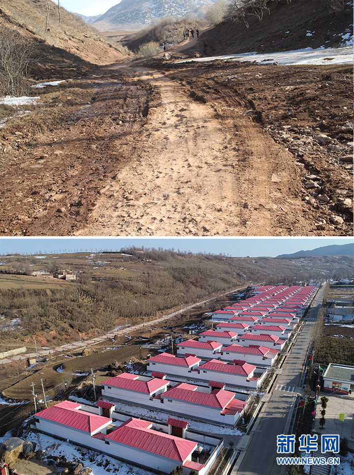 拼版照片:上圖為2013年3月4日拍攝的甘肅省定西市渭源縣元古堆村鄉道。新華社發(吳魯 攝);下圖為2021年2月6日在渭源縣元古堆村拍攝的鄉村道路和易地扶貧搬遷點。新華社記者馬希平攝