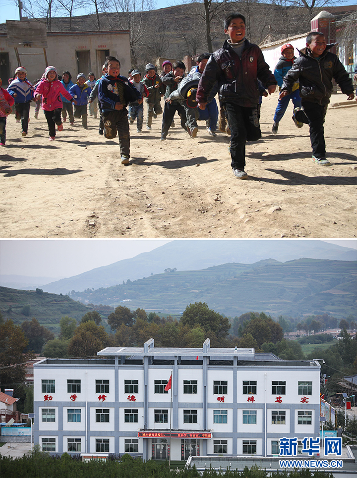 拼版照片:上圖為2013年3月4日拍攝的甘肅省定西市渭源縣元古堆小學學生在課間活動。新華社發(吳魯 攝);下圖為2020年8月22日拍攝的渭源縣元古堆小學。新華社記者 馬希平 攝