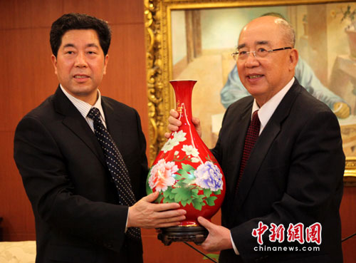 4月9日,中國國民黨榮譽主席吳伯雄(右)在臺北會見了首次率團訪臺的湖南長沙市市委書記陳潤兒(左),並互贈禮物。會見中,吳伯雄表示兩岸同文同種,應繼續加強交流,實現互利雙贏。中新社發 羅欽文 攝