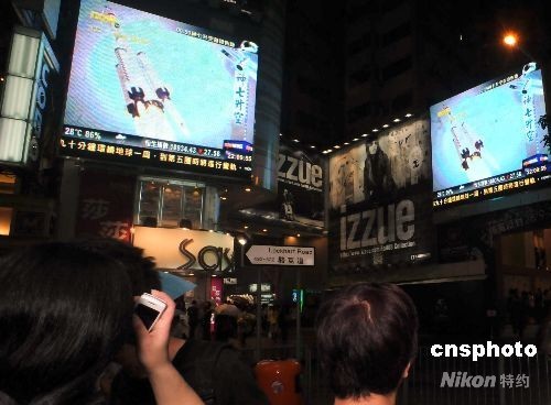 9月25日晚,中國載人太空船“神舟七號”在中國酒泉衛星發射中心順利升空。圖為“神舟七號”升空相關新聞片段在香港銅鑼灣鬧市播放,吸引市民駐足觀看。 中新社發 鄧慶樂 攝