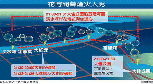 媲美北京奧運煙火“腳印”,臺北花博周六晚間開幕煙火,以大紅燈籠煙火及連串花博愛心,接續施放,並串連基隆河、淡水河及大稻埕碼頭長六公里河岸,屆時花博會的五色LOGO、梅花及愛心圖案煙火將照亮整個北市夜空。