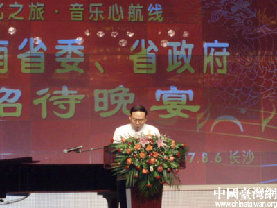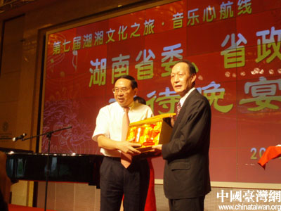 梅克保在致辭中簡要介紹了湖南省的基本情況和經濟社會發展情況。梅克保說,湖南歷史悠久,文化底蘊深厚,是中華農耕文化的發源地之一。以心憂天下、敢為人先、經世致用為特點的湖湘文化為世人矚目,更影響和造就了一代又一代的傑出人才。湖南資源豐富,以“魚米之鄉”、“有色金屬之鄉”、“非金屬礦之鄉”著稱于世,湖南的旅遊資源也十分豐富,山清水秀,名勝古跡甚多。同時,湖南也是一方改革開放的熱土,湖南原本是一個農業大省,當前正在加速推進新型工業化進程,經濟快速發展的同時,科技、教育、衛生等各項社會事業也獲得了全面的發展。相信來自寶島臺灣的師生們一定會為三湘四水的美麗風光所吸引,為絢麗多姿的湖湘文化所興奮,為情意綿綿的湘音湘曲所陶醉,兩地師生會以火一樣的激情、水一樣的深情譜寫出湘臺兩地情誼山高水長的動人華章。